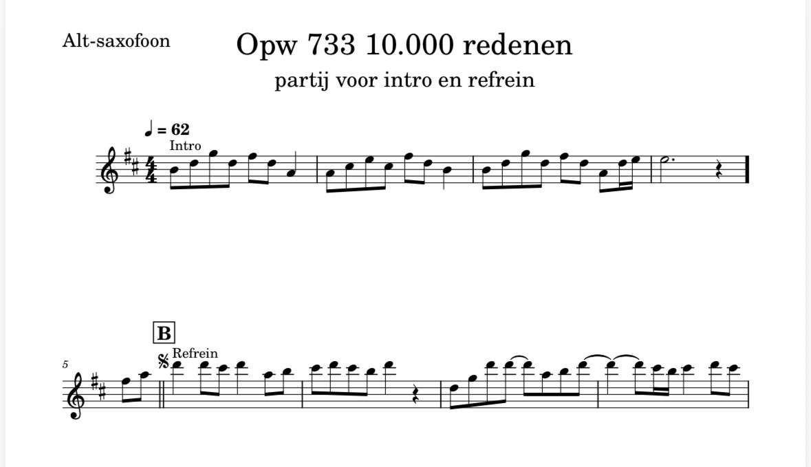 Bovenstem / tegenstem bij opwekking 733 10.000 Redenen. Dit is een arrangement voor Altosax en past goed bij de originele partij uit de opwekkingsbundel. In dit arrangement is de partij uitgewerkt voor het intro en het refrein(tegenstem)